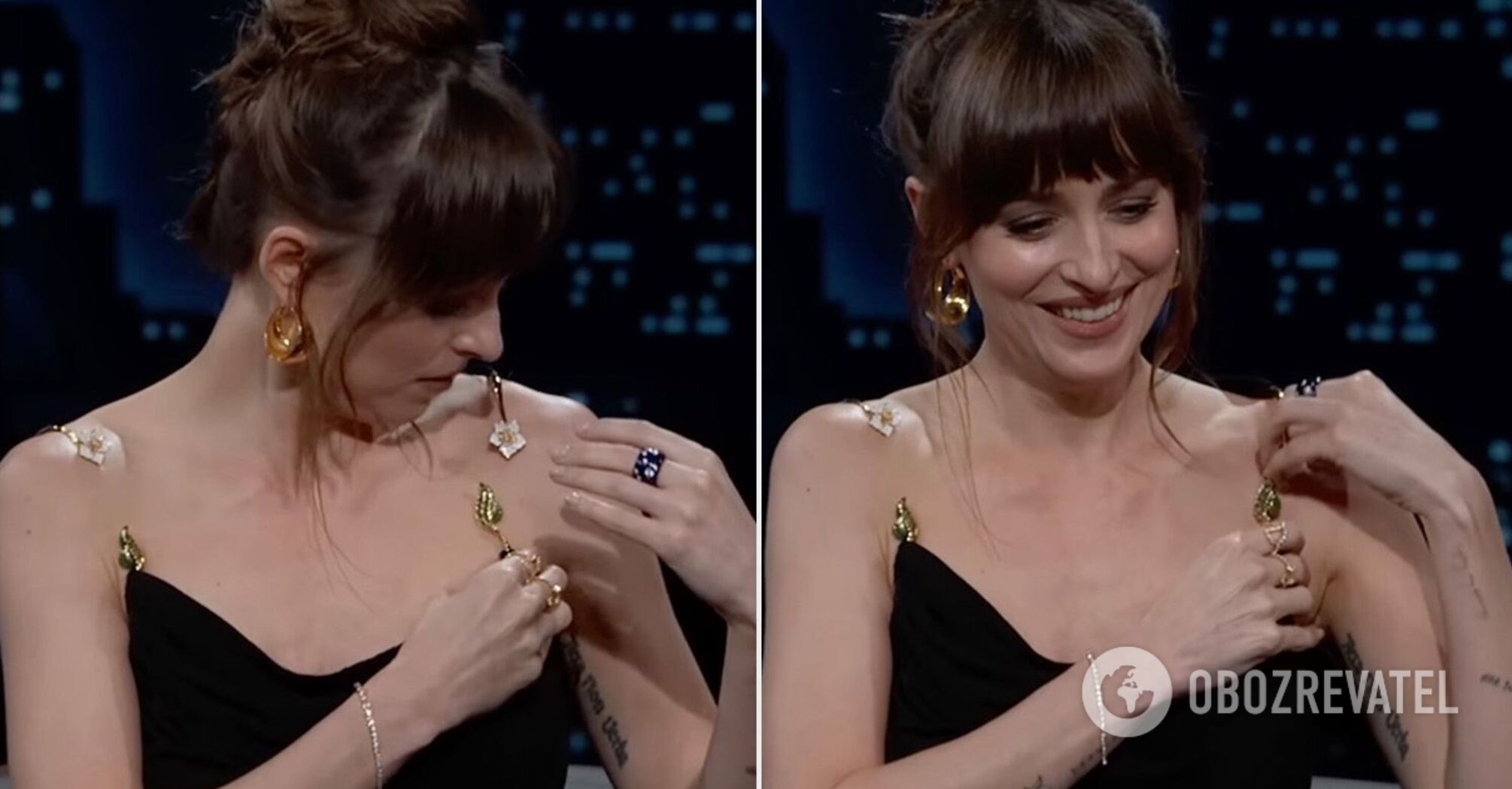 "Część twojej sukienki właśnie odpadła. Wszystko w porządku?" Jimmy Kimmel zapytał gwiazdę. "Moja sukienka po prostu... po prostu spadła" - odpowiedziała ze śmiechem Dakota. Gość miał na sobie czarną sukienkę z metalowymi detalami ozdobionymi kwiatowymi elementami, które służyły jako ramiączka. Wydaje się, że jeden z pasków pękł, dlatego Johnson musiała go przytrzymać.
