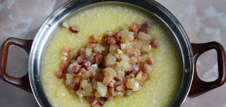 6. Wszystkie składniki są gotowe, więc możesz przygotować owsiankę. Wlej proso na talerz, połóż smażoną cebulę i boczek na wierzchu i gotowe!