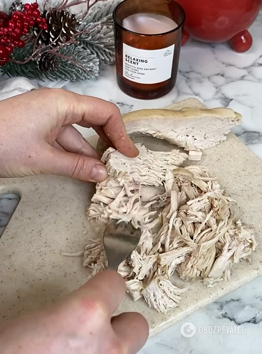 1. Ugotowany filet z kurczaka podzielić na włókna.