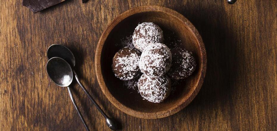 6. Uformować małe kulki i obtoczyć w wiórkach kokosowych, posiekanych orzechach lub okruchach herbatników.