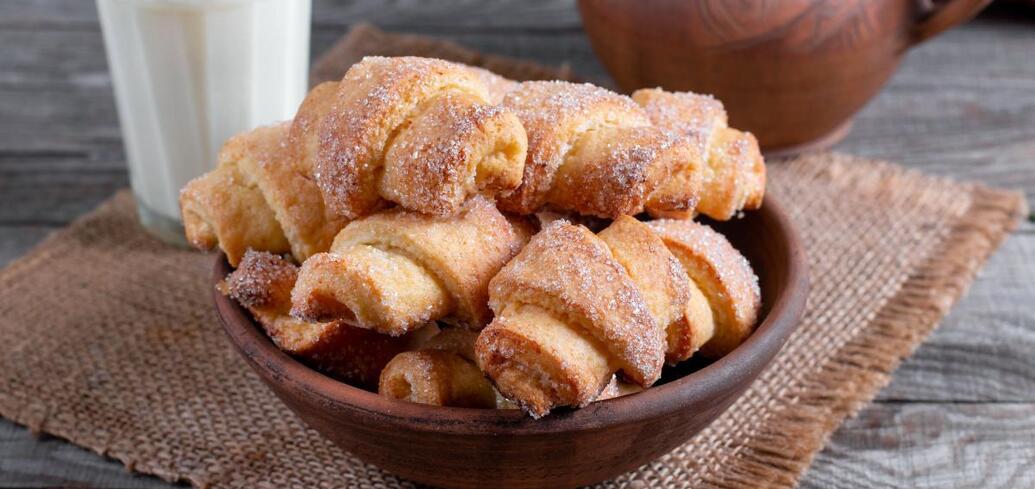 5. Zwiń każdy trójkąt w obwarzanek, następnie obtocz w cukrze i umieść na blasze do pieczenia.