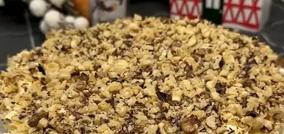 9. Na ostatnią warstwę wysuszyć orzechy włoskie na suchej patelni, posiekać nożem i posypać sałatkę.