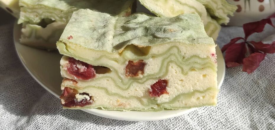 5. Ułóż kawałek pity odpowiedniej wielkości. Nałóż na niego kilka łyżek masy twarogowej. Ponownie ułóż pita i tak dalej, aż do końca.