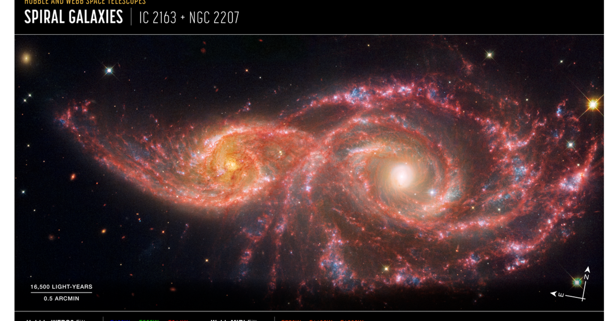 Na zdjęciu Webba, wykonanym za pomocą instrumentu MIRI, zimny pył obu galaktyk świeci niesamowitą bielą. Na dole tego zdjęcia znajduje się jasna plama z charakterystycznymi ośmiokątnymi gwiazdopodobnymi "kolcami dyfrakcyjnymi" utworzonymi przez lustra teleskopu. Zespół Webba zauważył, że w tym miejscu "wiele gwiazd formuje się w krótkich odstępach czasu".