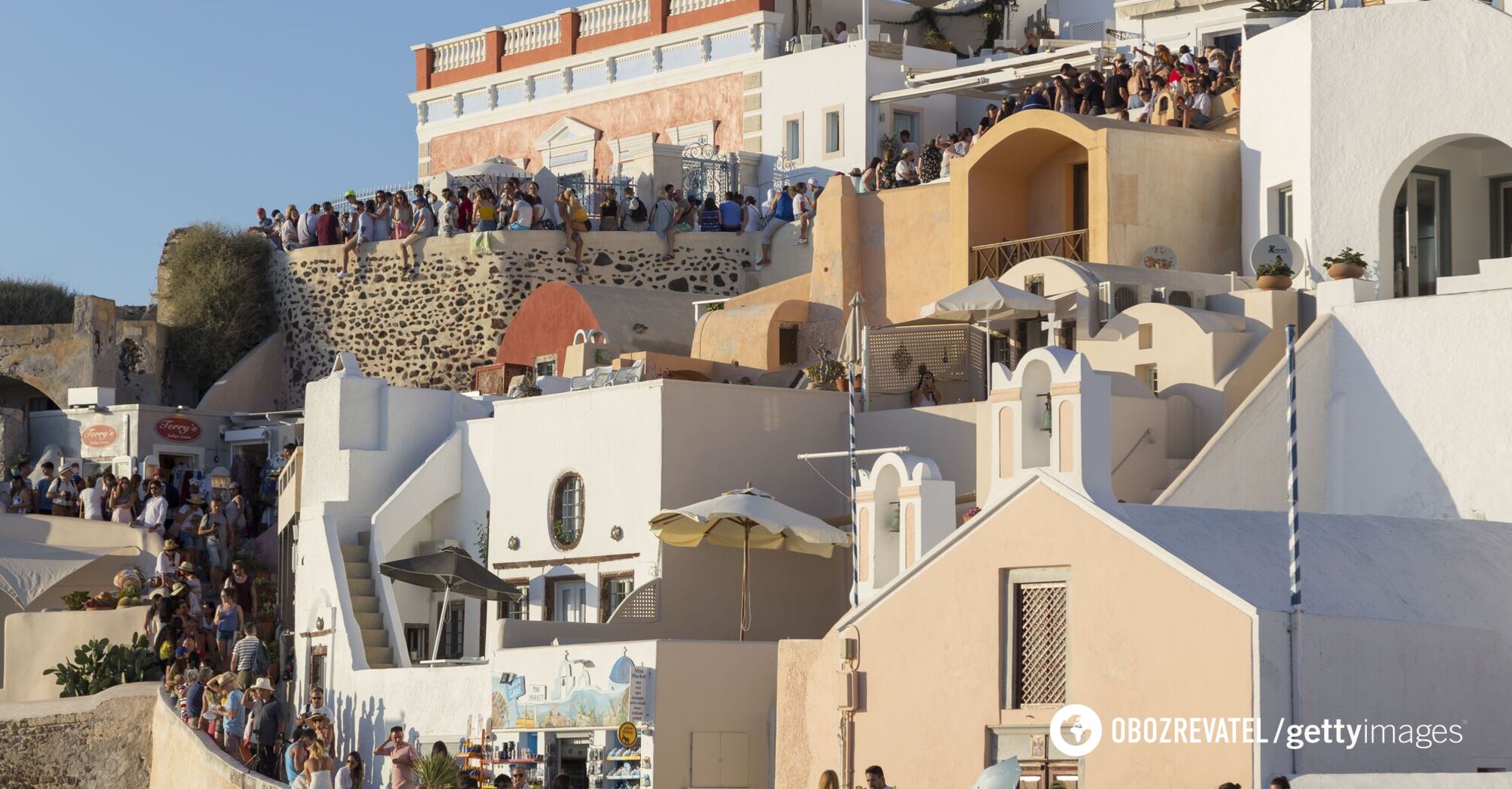 Według CNN Travel, około 17 000 pasażerów statków wycieczkowych dziennie schodzi na ląd w szczycie sezonu. Wszyscy oni marzą o zrobieniu zdjęć w lokalnej stolicy, Firze, lub w mieście Oia na północno-zachodnim krańcu wyspy, gdzie mogą oglądać wspaniałe zachody słońca. Tłumy turystów na ulicach w ciągu dnia stają się tak duże, że uniemożliwiają mieszkańcom normalne życie. Wszystko zmienia się jednak diametralnie po zmroku