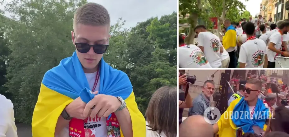 Piłkarz podczas całego wydarzenia nie rozstawał się z flagą Ukrainy.