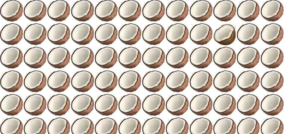 Oto ta opublikowana przez OBOZ.UA. Zadanie wygląda na proste - znaleźć jeden kokos, który tylko nieznacznie różni się od dziesiątek innych. Ale o poprawną odpowiedź będziesz musiał powalczyć z czasem, ponieważ aby uzyskać najlepszy wynik, będziesz musiał wykonać zadanie w 5 sekund.