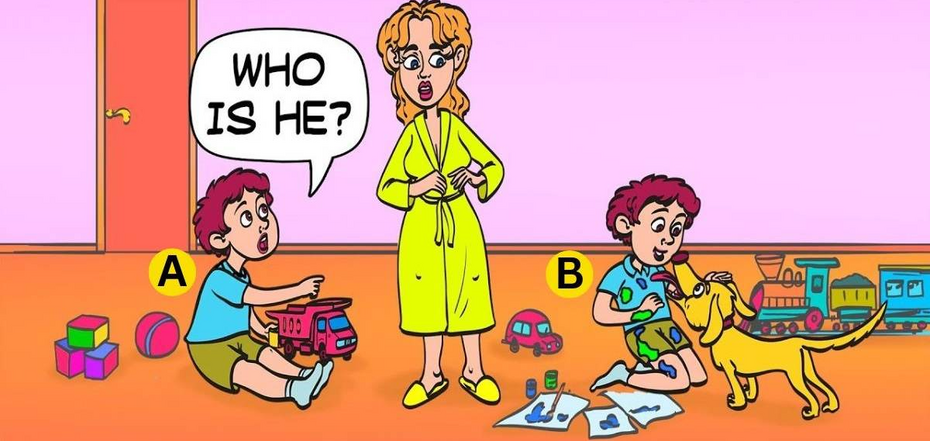 Widzisz scenę w pokoju dziecięcym, gdzie bawi się dwóch chłopców. Jeden siedzi na podłodze z maszyną do pisania (chłopiec A), a drugi rysuje coś i bawi się z psem (chłopiec B). Pierwszy z nich pyta matkę: "Kim on jest?", a matka jest wyraźnie zdezorientowana jego pytaniem.