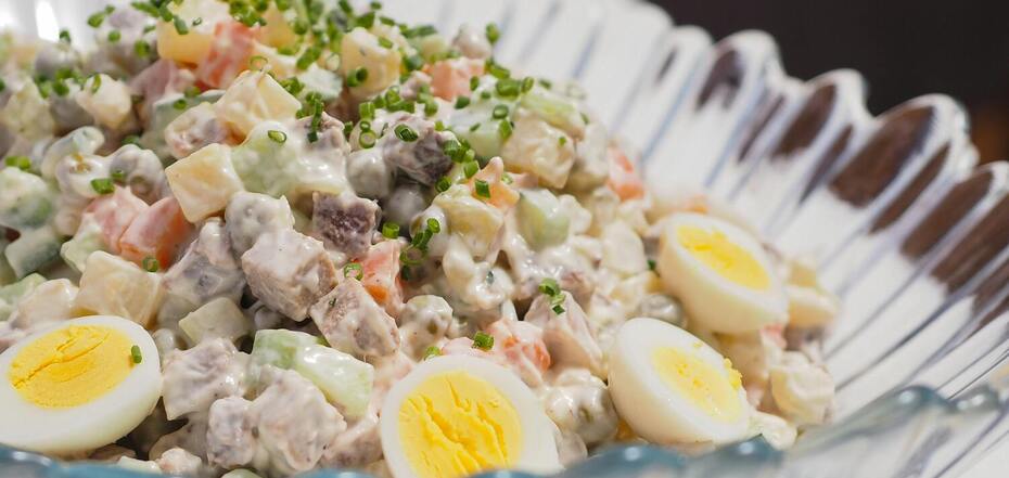 Bez kiełbasy i majonezu: zdrowa i smaczna sałatka Olivier z jabłkiem i rybą
